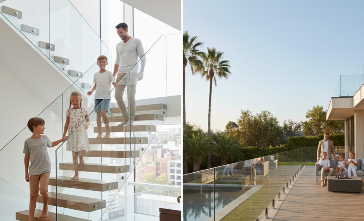 Indoor glass railings are constructed using tempered or laminated safety glass, designed to withstand impact and daily use. These materials meet building code requirements and provide peace of mind for households with children or pets.